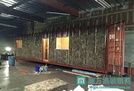 集装箱表面安装了龙骨,方便填入岩棉保温材料,最外层再安上彩钢板,这样一来既能起到保温隔热的作用,又能把原有破旧的铁皮外观覆盖起来,更加地美观大方。