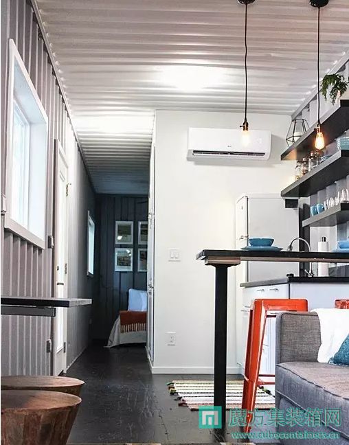经过改造,原本简陋破旧的废弃集装箱化身一间舒适温馨的小房屋,起居室与厨房连同,一张高台区分开两个空间。