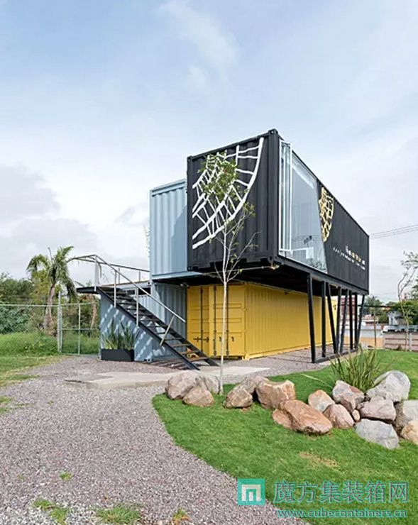 石路通向Linea Arquitectura建筑事务所,黄色以及浅蓝色的集装箱前后错位叠放在首层,上层的两个集装箱分别错位放置在黄色集装箱顶部的两侧,两个箱体间由集装箱波浪板打造的假柜相连,与整体建筑风格一致,后方的钢直梯连接不同楼层空间,错位摆放的设计创造了额外的露天平台和避雨空间,架空结构搭建了额外的长廊,室内外空间兼备,造型独特。