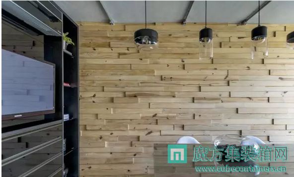 一层是会客室、会议室和公共休闲空间:硅钙板覆盖了大部分的墙面,掩盖了集装箱自带的波浪板;中间是钢架构连通的玻璃幕墙,中空部分种上了植物,环境优美,光线充足;带有半户外走廊,空间充足。