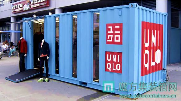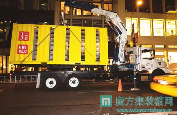 优衣库的集装箱专卖店,以醒目的黄色和蓝色箱体为底,搭配红白色的品牌LOGO,非常简单明快。箱体两面是类似试衣镜的长条形玻璃,起到商品展示的作用,同时起到很好的采光效果。